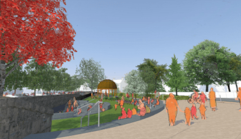A few constituents have been in touch with me in the last month to ask if SDCC or Bretland Construction have any more visuals of the intended look of the finished village green. I’m happy to add that SDCC sent me a view, looking South towards Courtney’s Pub [sketched in grey in the image] and it does help a bit in terms of seeing the completed work that’s underway.