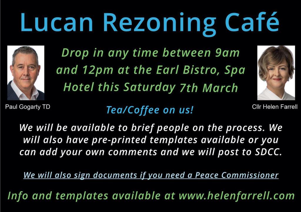 Don’t know where to start with making a submission? Email me at hfarrell@cllrs.sdublincoco.ie or DM me on WhatsApp 087-2794936. I can help you with the submission, give you more info, give you some suggested wordings, or meet you in person at one of my drop-in cafe clinics in the Lucan area (weekend and evening times available). Alternatively you can read some of the existing submissions here to get some inspiration.